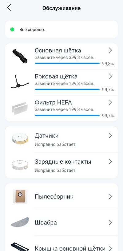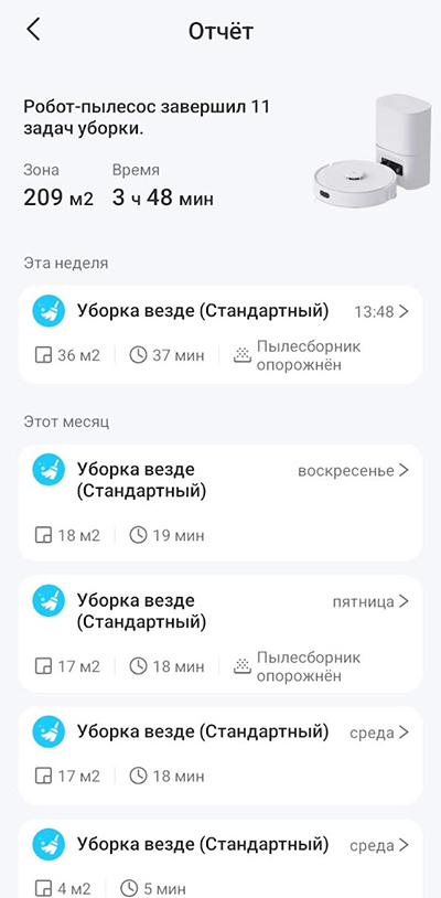 Ну и, в общем-то, все. Этот робот-пылесос можно запускать вручную, можно через приложение, можно по расписанию или по программам умного дома. Процесс уборки очень наглядный, за ним можно следить через приложение, вся история уборок, разумеется, хранится в приложении.