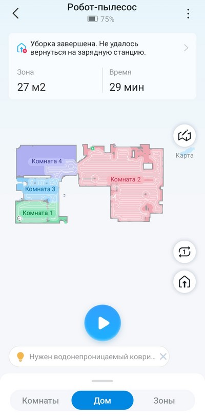 У меня на третьем этаже кроме кабинета находится еще коридор и гостевая комната. Запустил робота на все пространство. Он нормально построил карту, но при этом гостевую комнату почему-то посчитал за две разных комнаты (ту зону, которую он отметил "Комната 1" - там стоит кровать и рядом с ней довольно близко - шкаф. Под кроватью лежал удлинитель, я забыл его убрать перед уборкой - робот запутался в проводе и не смог вернуться на базу.
