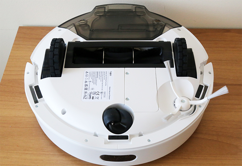 Сзади расположена комбинированная емкость для мусора и там же контейнер для воды. В центре - две колеса и турбощетка, ближе к передней части круговая щетка и вращающееся в вертикальной и горизонтальной плоскости колесо.
