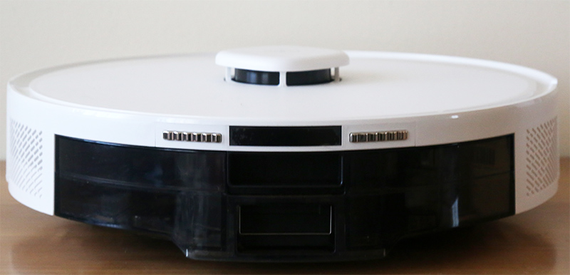 Типовой дизайн робота-пылесоса. В центре находится небольшая башенка лидара (лазерной системы навигации). В нижней части верхней крышки - три управляющих кнопки. В торцевой передней части расположен бампер с датчиками.