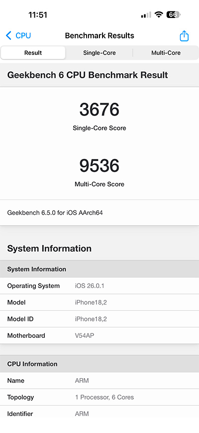 Процессор: Apple A19 Pro (3 nm), Hexa-core (2x4.26 GHz + 4xX.X GHz)