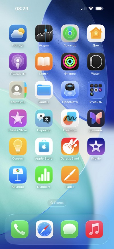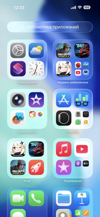 iOS 26, главный десктоп и установленные в системе приложения.