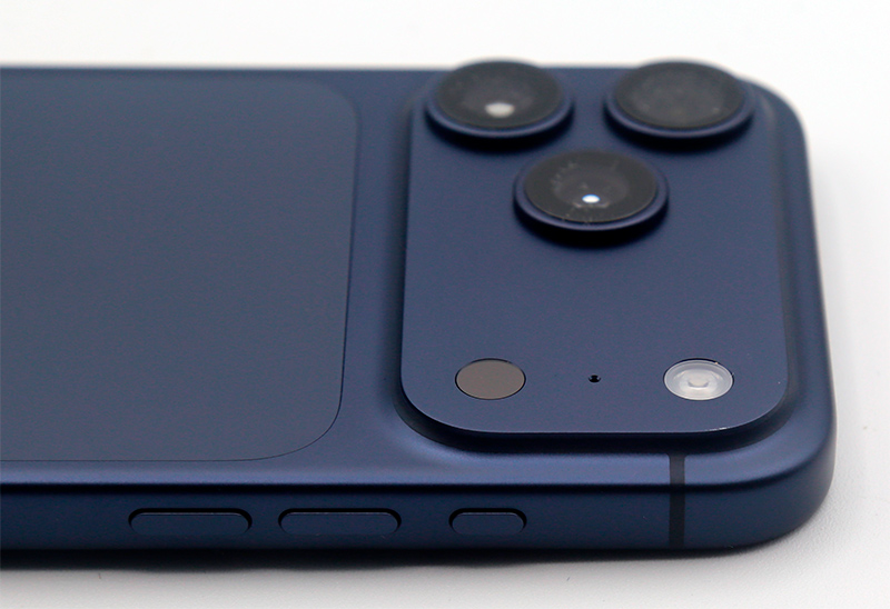 Задняя крышка - анодированный алюминиевый сплав. В этом поколении Apple радикально поменяла дизайн задней части: блок камер теперь растянут на всю ширину задней крышки, а под блоком камер на задней крышке находится большая керамическая вставка, выполняющая декоративные функции.