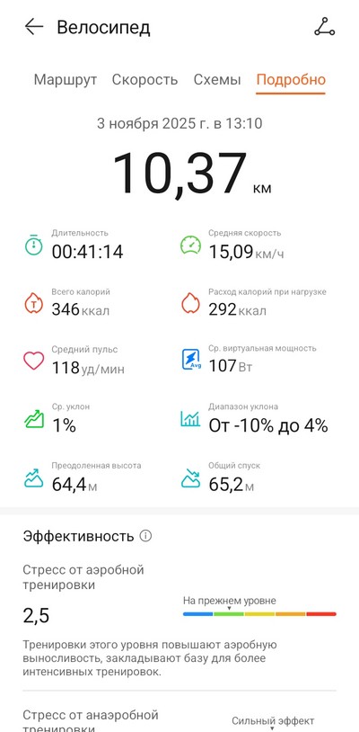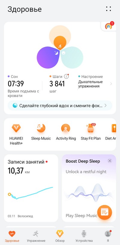 Главная страница Huawei Health с измеренной информацией. Измеренная тренировка.