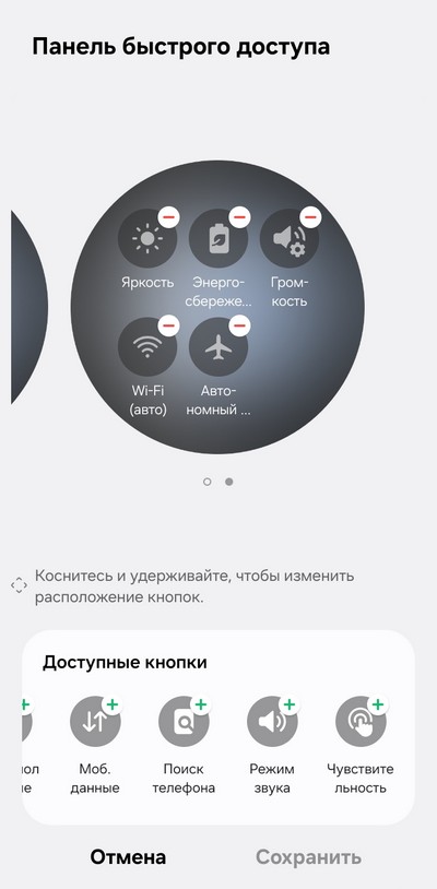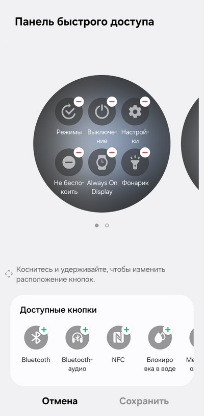 Свайп от циферблата вниз - - панель быстрого доступа: выбор режима (сон, театр), выключение, настройки, отключение любых уведомлений, режим AOD , отключение звука/вибрации, фонарик, яркость экрана, включение энергосбережения, громкость, Wi-Fi,  самолетный режим, подключение наушников, поиск смартфона и так далее. Быстрые переключатели - их количество и порядок следования - можно настраивать.