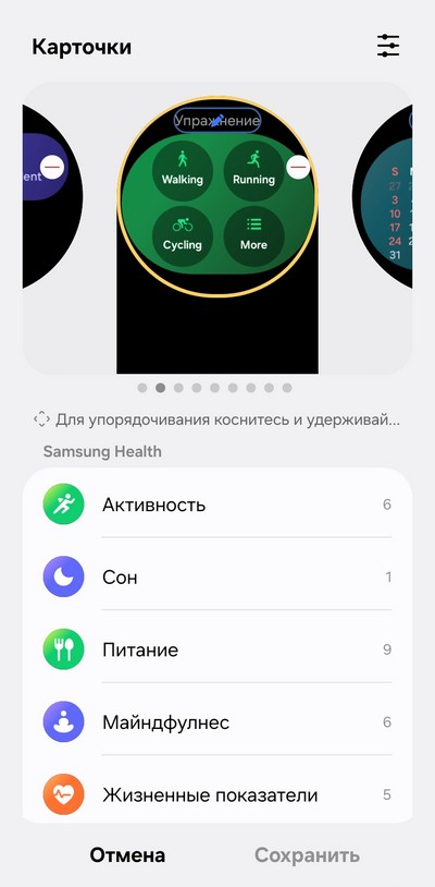 Настройка экрана приложений - там можно изменять порядок пиктограмм, также можно менять вид экрана приложений. Карточки - это виджеты приложений, которые появляются справа от циферблата при прокрутке. Вы сами определяете, какие виджеты вы там хотите видеть.