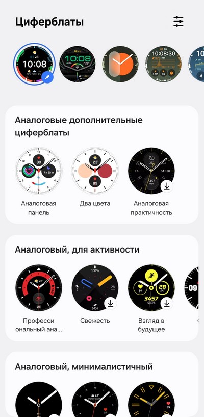 Главная страница, выбор циферблатов. В Google Play циферблатов для этих часов - великое множество на любой вкус, как платных, так и бесплатных. Многие циферблаты настраиваются под ваши предпочтения, также есть целые конструкторы циферблатов.