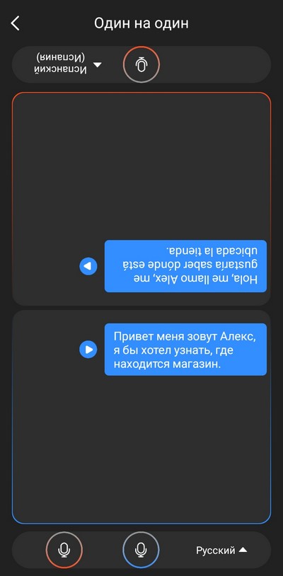 Голосовой помощник в режиме синхронного перевода работает крайне криво: сначала он переводит правильно, но потом зачем-то начинает распознавать и переводить уже сделанный перевод, и дальше начинается каша. А вот режим "Один на один", когда ты держишь смартфон и показываешь перевод собеседнику, работает вполне нормально. И там хорошо придумано показывать текст вверх ногами, чтобы его собеседник нормально видел.