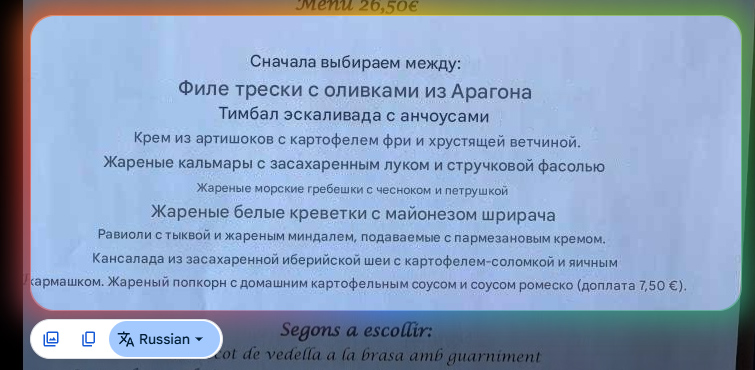Например, открыли меню ресторана на экране, выделили Lens блок текста, задали перевод на нужный язык. В данном случае это перевод с каталанского.