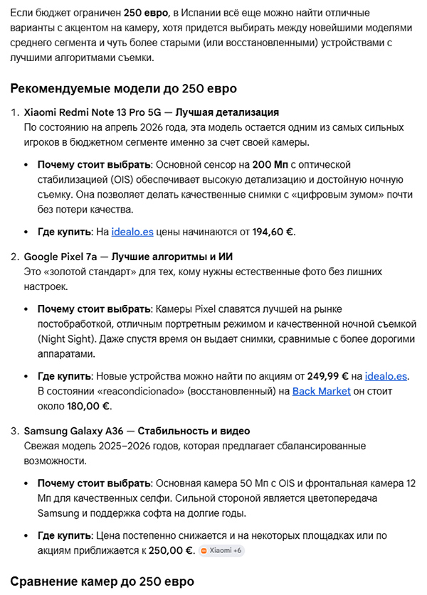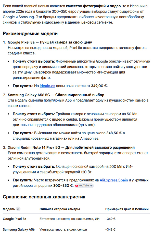 Замечу, что AI Mode - это фактически встроенный в приложение чат-бот. Вы можете там задавать достаточно сложные вопросы, например, "какой смартфон купить в Испании за цену порядка 300-350 евро, если прежде всего важно качество камер", и вы получите подробный ответ вида (скриншот обрезан снизу):
