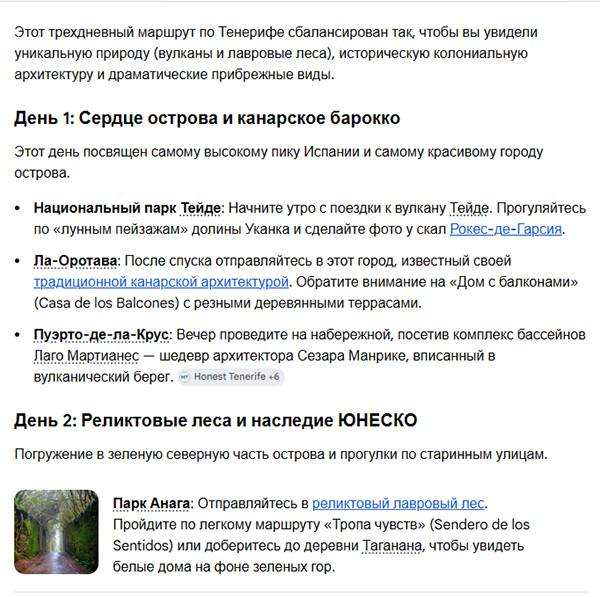 Ну или, например, вот такой запрос: "Составь трехдневный маршрут поездок по Тенерифе - интересуют прежде всего достопримечательности, природа и архитектура".
