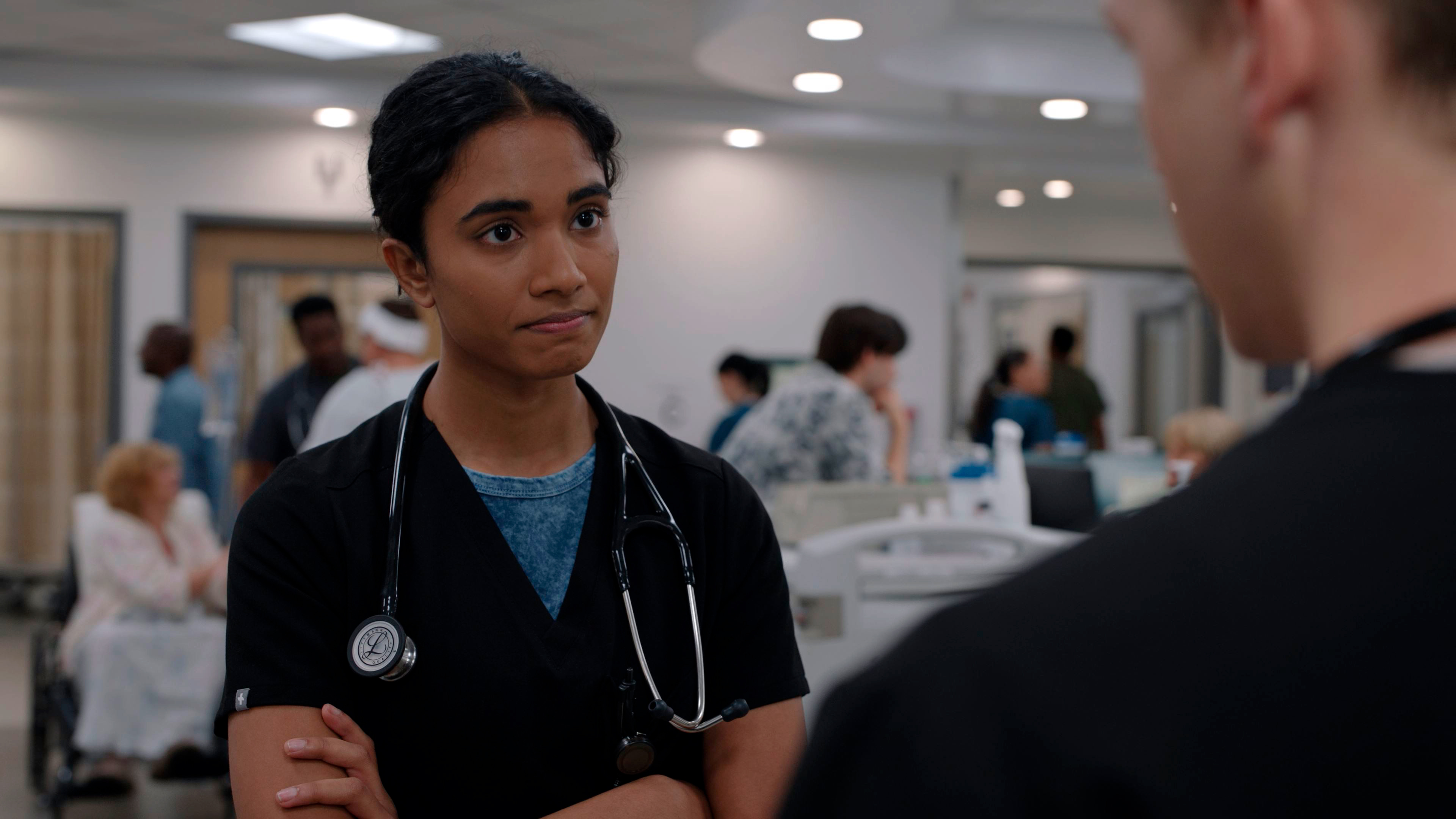 Из врачей на второе место я бы поставил Трэйси Айфичор, сыгравшую доктора Хизер Коллинз. Хизер работает во время тяжело проходящей беременности, у нее есть всякие личные проблемы, с доктором Робби ее явно раньше связывали какие-то отношения, и он к ней относится очень тепло. Трэйси - очень харизматичная актриса: вот вроде бы ничего такого экстраординарного она не демонстрирует, но персонаж очень заметный и интересный, обращает на себя внимание сразу же.