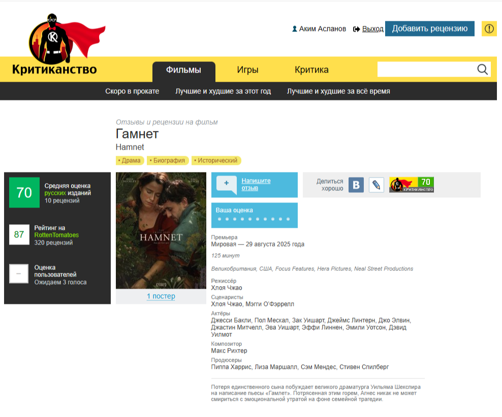 Зато на Критиканстве, куда я после публикации в качестве небольшого хобби традиционно закидываю рецензии Алекса, он вполне себе тот ещё Гамнет. 😄