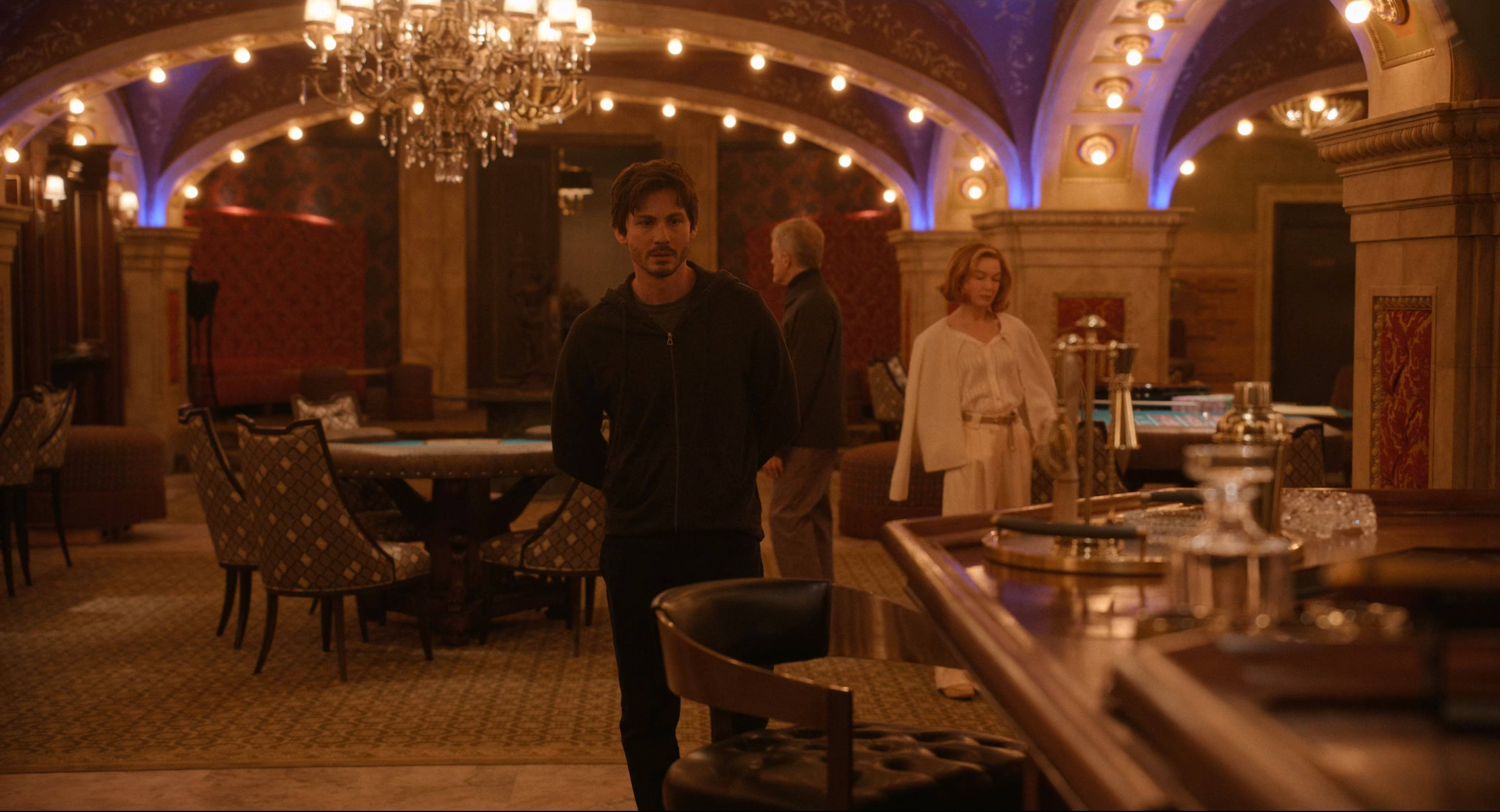 Но, к сожалению, после этого сериал унесло в какую-то очень надуманную историю с подпольным казино и троицей миллиардеров - самых богатых людей Нью-Йорка: инвестора Бэша Стида (Кристоф Вальц), дизайнерши интерьеров Камилы Уайт (Рене Зельвегер) и наследника крупной фармацевтической компании Джея Пфлуга (Логан Лерман), которые, видите ли, хотят купить "Арконию".