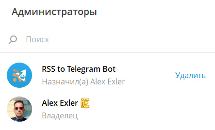 Сначала вам нужно создать новый телеграм-канал для автопостинга (ну или решить, в какой из созданных каналов вам нужно транслировать RSS-поток), после чего добавить этого бота в администраторы (чтобы он мог делать посты): заходите в настройках канала в раздел "Администраторы", там нажимаете "Добавить администратора" и поиском находите @RSStT_Bot.