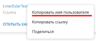Название канала можно посмотреть в профиле канала: там будет стоять ссылка на канал, по ней нужно щелкнуть правой кнопкой мыши и выбрать "Копировать имя пользователя".