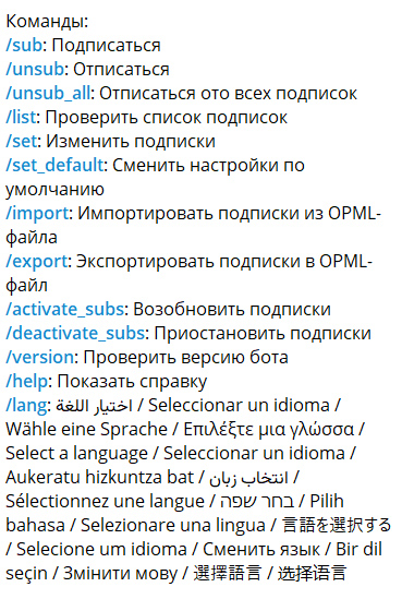 После этого возвращаетесь в RSS to Telegram Bot. Вот список его команд.