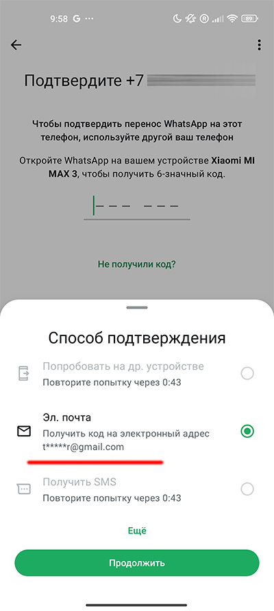 Вот, например, начало активации WhatApp на новом смартфоне. Но на старом смартфоне WhatsApp уже нет, и тогда нажимаем ссылку "Не получили код?", после чего получаем предложение получить код на адрес электронной почты. После ввода этого кода приложение также затребует тот самый PIN-код, который вы задавали раньше. И новая копия заработает.