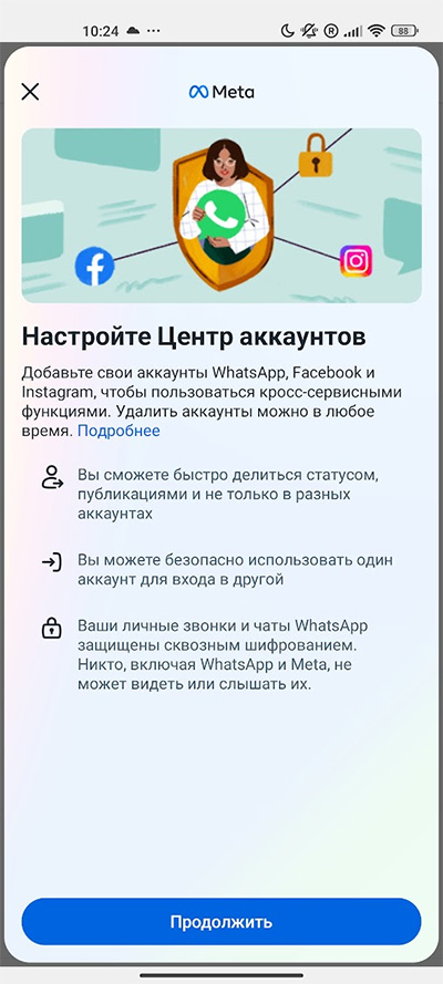 Есть еще один вариант активизировать новую версию WhatsApp - через аккаунт Facebook или Instagram. Это же все принадлежит компании Meta, и в настройках WhatsApp вам нужно выбрать "Центр аккаунтов", и там добавить свой аккаунт Facebook и/или Instagram.