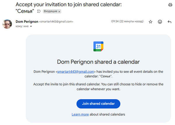 Добавленному новому участнику на почту будет отправлено письмо с приглашением, в котором нужно будет нажать на кнопку "Присоединиться к совместному календарю", чтобы он появился в его списке календарей.