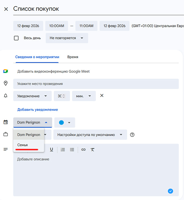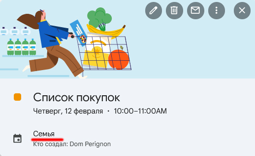 Некоторое время назад эта возможность в календаре Google пропала - там что-то изменилось. Перед этим Google присылал какие-то уведомления, в которых говорилось что-то о родительском контроле, о новом подходе к совместному доступу к записям календаря, ну и в результате мне пришлось разбираться с тем, как теперь сделать так, чтобы жена видела список покупок, созданных мной, а я видел список покупок, созданных ею.