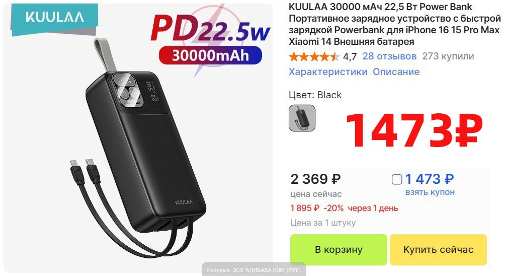 Поддерживает быструю зарядку мощностью 22.5 Вт, имеет порты USB и Type-C, встроенные кабели со штекерами Type-C и lightning, а также ЖК-дисплей.