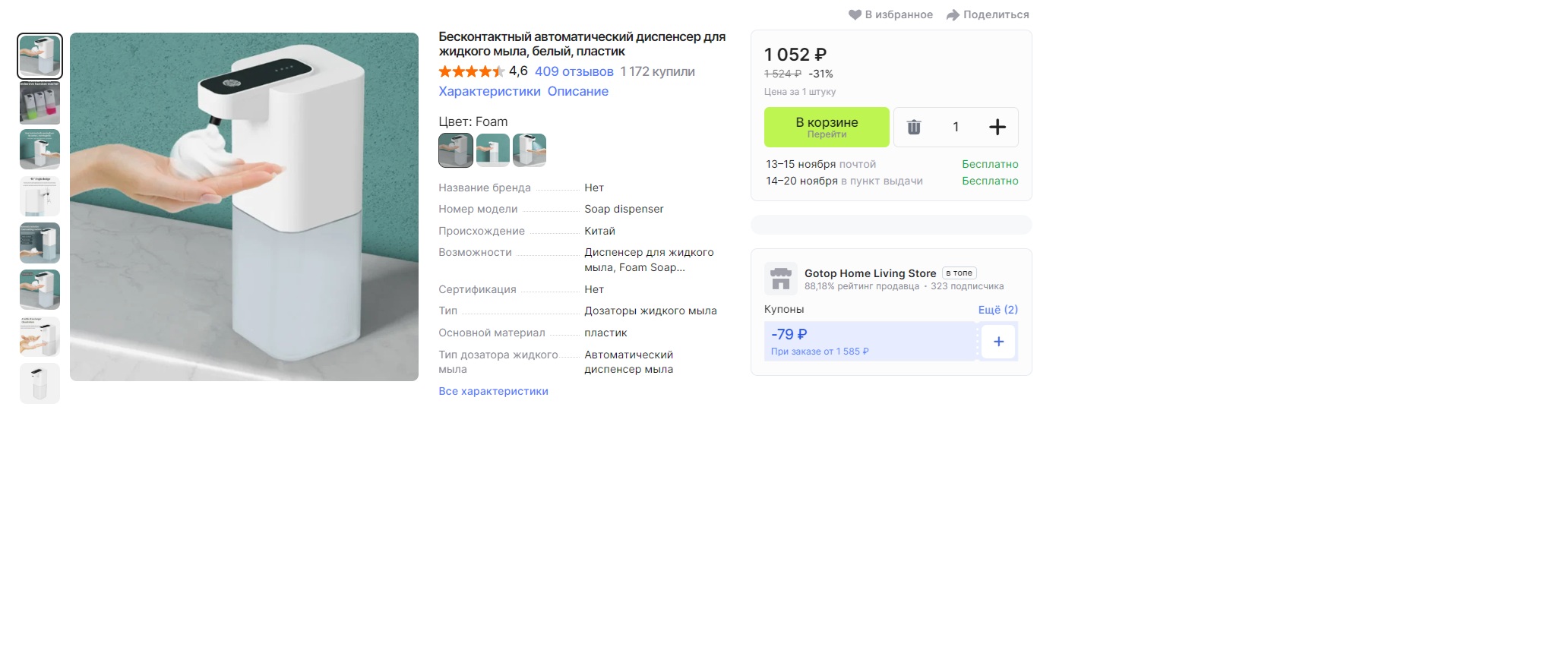 Бесконтактный автоматический диспенсер для жидкого мыла Надежный, как автомат Калашникова. Удобно заправлять, 3 степени интенсивности пенообразования, долговечный. Сам пользуюсь второй год. Цена 1052 р. с бесплатной доставкой, раньше хотели денег за шиппинг. Рекомендую. Именно такой, как на картинке, там вроде бы три варианта.