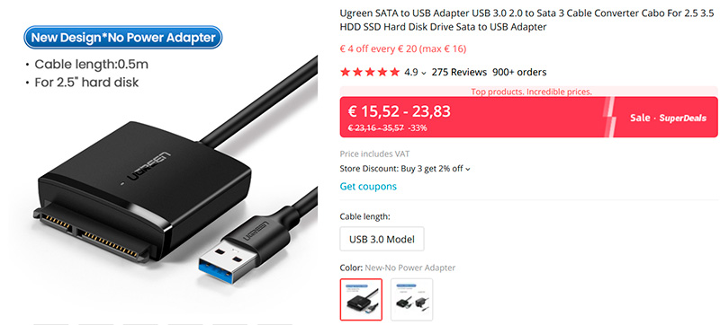 Дома валяются всякие SATA-диски, которые можно использовать для бэкапов или файл-хранилищ, но не хочется возиться с док-станциями для дисков? Покупаете простенький SATA-адаптер UGREEN, после чего с легкостью подключаете любой SATA-диск (хоть 3,5-дюймовый, хоть 2,5-дюймовый) к ПК или ноутбуку через быстрый порт USB 3.0. И никаких док-станций - все быстро и удобно!