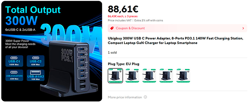 GaN-адаптер Ubigbuy на 300 Вт суммарной мощности с поддержкой PD 3.1, в котором аж 6 портов Type-C (140 Вт, 65 Вт, 45 Вт) и два порта USB-A на 10 Вт. Шесть степеней защиты. Может питать любые ноутбуки (даже два сразу), к розетке подключается собственным кабелем. Закажу себе, я тут в Штатах столкнулся с тем, что мой нынешний адаптер для ноутбука на 65 Вт, у которого есть три дополнительных порта для зарядки других гаджетов, не вытягивал одновременно ноутбук, смартфон и часы - не хватало мощности. А у этого сто процентов мощности хватит.