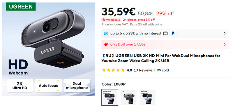 Недорогая вебкамера Ugreen (ссылка для РФ) с разрешением 2К (2048×1080 пикселей). Два микрофона, защитная шторка, есть крепление на дисплей и на трипод.