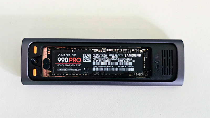 У этого корпуса в комплекте: универсальный кабель USB-A (Type-C) - Type-C, отвертка для откручивания нижней крышки, резиновый чехол на корпус, силиконовая прокладка на SSD для отвода тепла, руководство пользователя.
