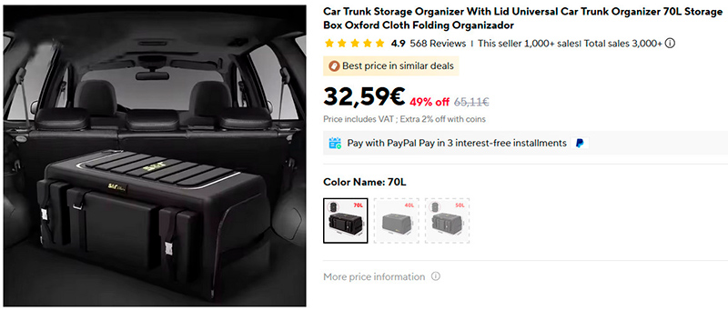 Вместительный органайзер для багажника автомобиля на 70 литров. И он складной: в сложенном виде в высоту - всего 10 см.