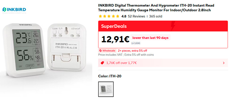 Настольный (также его можно подвешивать) термометр/гигрометр INKBIRD ITH-20. Удобен тем, что показывает не только текущие значения температуры и влажности, но и минимальные и максимальные значения этих параметров в течение дня.