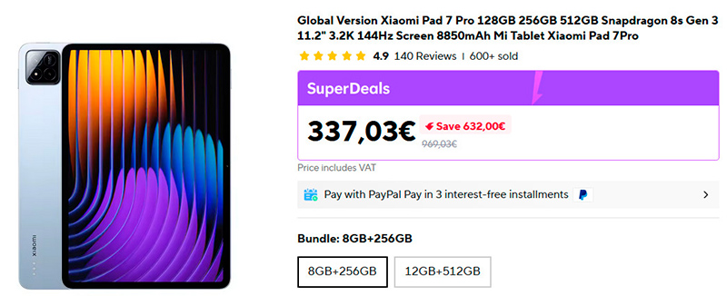 Хорошая цена на мощный планшет Xiaomi Pad 7 Pro, на европейском Amazon он где-то на 70 евро дороже. Мощная платформа, 11,2" дисплей с разрешением 2136 x 3200 пикселей и частотой 144 Гц, аккумулятор емкостью 8850 мАч с мощностью зарядки 67 Вт. Я делал обзор Xiaomi Pad 7 - у него менее мощная платформа и быстрая зарядка 45 Вт.