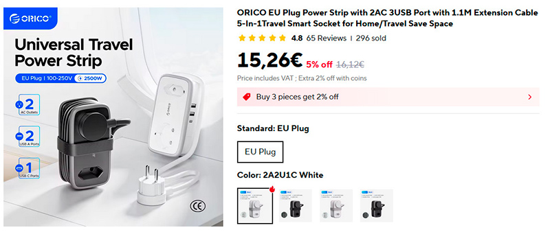 Удобный удлинитель и зарядный адаптер Orico: кабель 1,1 м, который компактно сворачивается, две розетки и три зарядных порта USB-A (есть вариант два USB-A и USB-C). Для поездок и для дома.