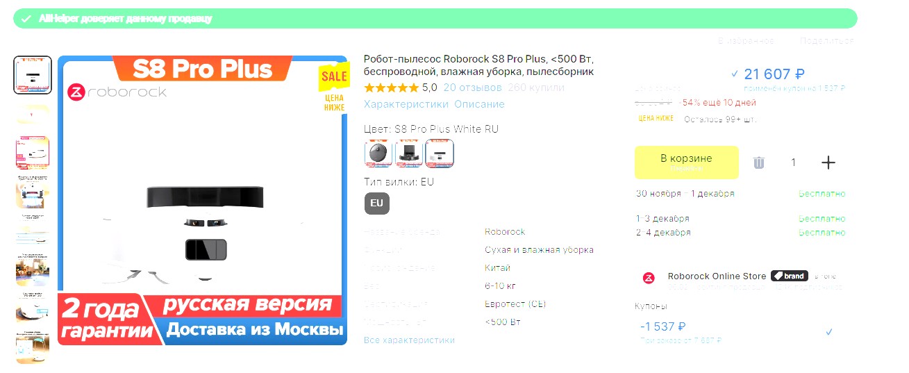 Робот-пылесос Roborock S8 Pro Plus с пылесборником по цене 21 607 руб.!