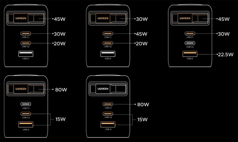 Еще одно устройство от компании UGREEN топовой серии Nexode - GaN-адаптер питания мощностью 100 Вт. Встроенный разматывающийся кабель Type-C длиной 75 см, еще два порта Type-C и порт USB-A. Встроенный кабель и верхний порт Type-C - мощность 100 Вт, второй порт Type-C - 30 Вт, порт USB-A - 22,5 Вт. Одновременно может заряжать до четырех устройств, включая ноутбук. MacBook Pro 14" от этого адаптера с нуля набирает 54% заряда за 30 минут. Все виды защиты: от высокого напряжения, от короткого замыкания, от пониженного напряжения, от перегрузки по току, защита от перегрева и перегрузки по мощности. По ссылке есть также более дешевые модификации этого адаптера - на 65 Вт и 45 Вт, они также имеют встроенный кабель и еще два порта.