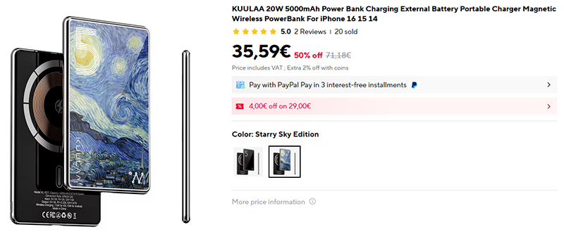 Симпатичный внешний аккумулятор с MagSafe KUULAA. Очень тонкий (6,9 мм) и легкий (110 г). Емкость - 5000 мАч, мощность зарядки 20 Вт.
