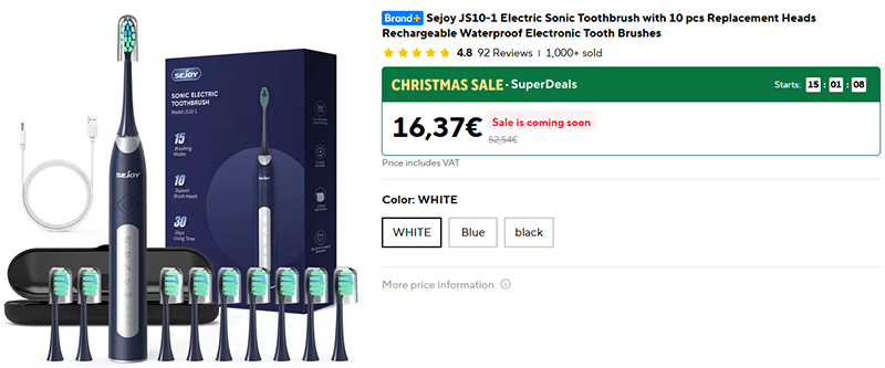 Электрическая зубная щетка Sejoy JS10-1. Входит в top лучших бюджетных электрических щеток. Хорошая функциональность, несколько режимов очистки, причем, несмотря на невысокую цену, в комплект входит твердый чехол и аж 10 сменных головок - хватит больше чем на два года (рекомендуется менять головку каждые 2-3 месяца). Более 1000 продаж со средним рейтингом 4,8.