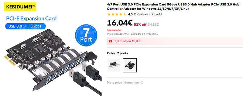 Если вам не хватает портов USB 3.0 на задней стенке ПК, то вот возможность добавить сразу 7 портов - расширитель PCI-E. Там же по ссылке есть более дешевая версия на 4 порта. А вот более дорогая версия: