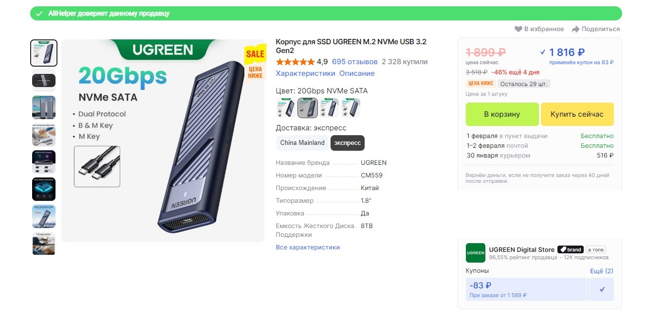 1) нужен разъём usb 3.2x2 20 gb СТРОГО. он редкий. встречается на системных платах интел 700 серии на задней стенке. и на некоторых ноутбуках. вариант usb 4.0 40 gb НЕ СОВМЕСТИМ, проверено.
