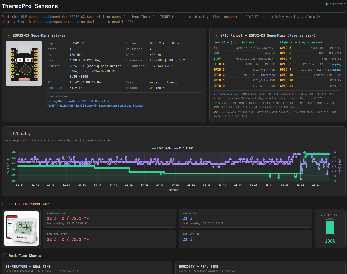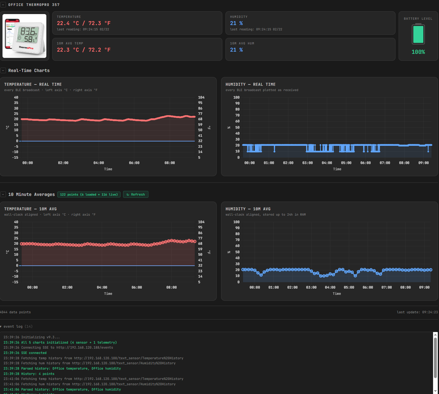 Что апп делает/описание проекта - берет информацию о влажности и температуре от BLE Thermopro 357 сенсора с экраном который можно брать за $12 на амазоне. Сенсор передает данные каждые через Bluetooth 5 секунд. ESP принимает данные, обрабатывает и хранит в памяти на следующие 24 часа. Можно зайти на встроенный примитивный веб сервер через wifi и посмотреть, но можно все это вытащить из ESP с помощью single-page app на котором можно построить очень красивые и практичные графики с динамикой изменения данных как со стороны сенсора, так и со стороны ESP.