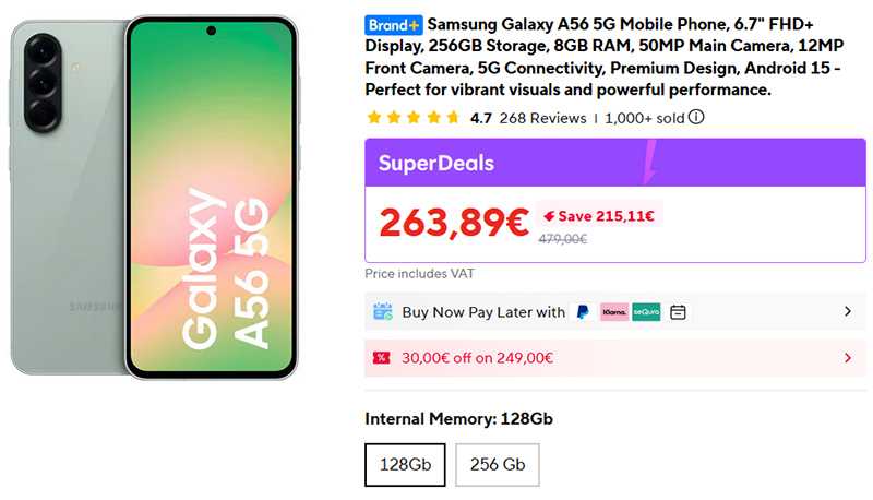 В рамках SuperDeals очень хорошая цена на один из самых продаваемых смартфонов Samsung Galaxy A56 5G. Версия с памятью 128 ГБ стоит 264 евро, версия с памятью 256 ГБ стоит 286 евро. На испанском Amazon минималььная цена на вариант со 128 ГБ - 310 евро.