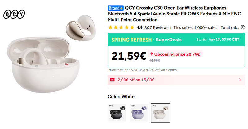 Для нелюбителей наушников-затычек - открытые наушники (они же каффы) QCY Crossky C30. Поддержка кодеков SBC/AAC, Bluetooth 5.4, мультипоинт, идеально подходят для всяких активностей, автономность - до 5,5 часов от одного заряда, до 25 часов при подзарядке от кейса, настройка через приложение, три варианта цветов. Больше 1000 продаж, общий рейтинг - 4,9.