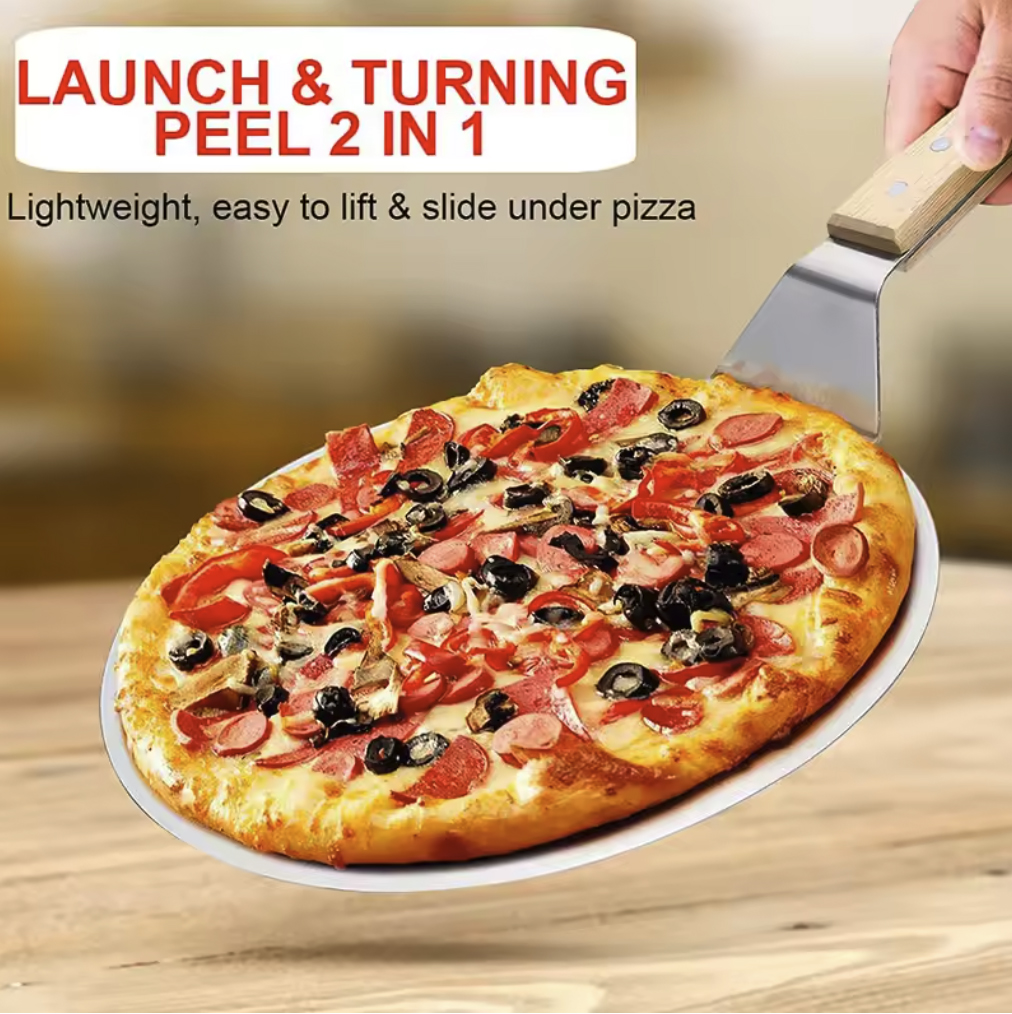 Эту проблему решает лопата для пиццы.Есть 10" и 12", лучше брать 12". Только обязательно нужно припудривать мукой, чтоб пицца легко соскальзывала.
