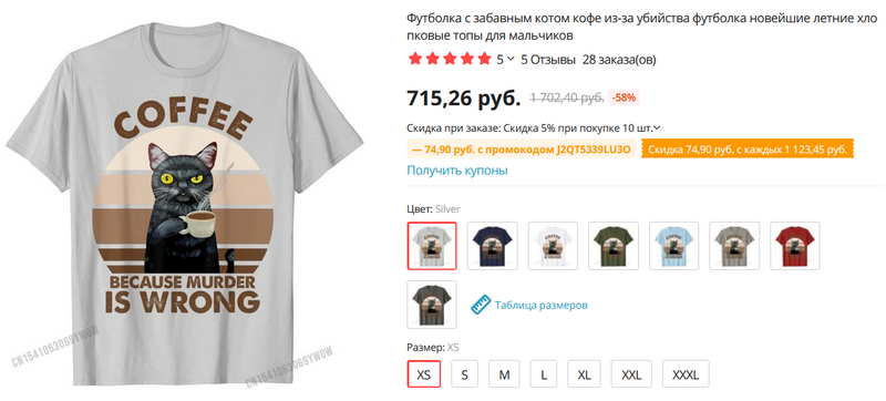 Выпуск был бы неполным без прикольной хлопковой майки с котиком. Разные цвета, разные размеры (проверяйте соответствие по таблице).