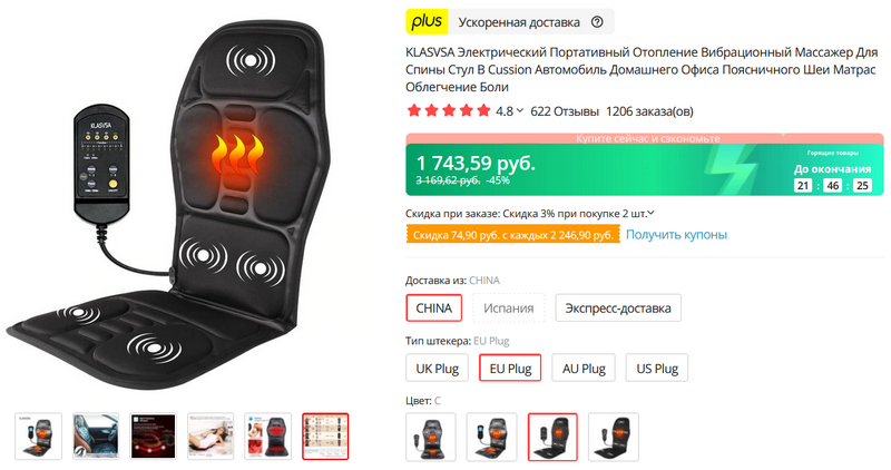 Накладка на кресло "2 в 1": массаж различных зон (9 массажных моторов), нагрев одной или двух зон. Может использоваться в автомобиле, но и дома также может пригодиться. В комплекте два адаптера питания: для обычной розетки и для прикуривателя автомобиля. И есть четыре вида этих накладок, отличающихся пультом управления и нагревом одной или двух зон.
