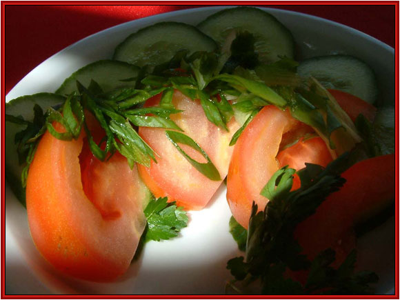 Данным кадром завершается экспозиция макро-фотографий. Это овощной салат - огурцы, помидоры и лук. Но в таком варианте выглядит достаточно сексуально, да?