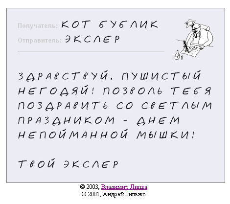 Второй вариант - открытка, созданная для вашего визави самим Андреем Бильжо! Честное слово! Вводите имя и адрес получателя, а также поздравительный текст, после чего получаете примерно следующее: