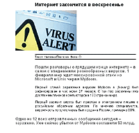 Третье. Журналисты - это что-то с чем-то! Я такого бреда начитался об этом вирусе - хоть стой, хоть падай. Хорошо хоть не договорились до того, что вирус по ночам вылезает из компьютера, открывает холодильник и сжирает всю хозяйскую колбасу. Но зато договорились до некоторых других шедевров. Особенно в этом плане меня поразила статья на Gazeta.ru. Да-да, именно статья в сетевом солидном издании, а не в глянцевом женском журнале. Статья называется "Интернет закончится в воскресенье". Первый шедевр, цитирую: